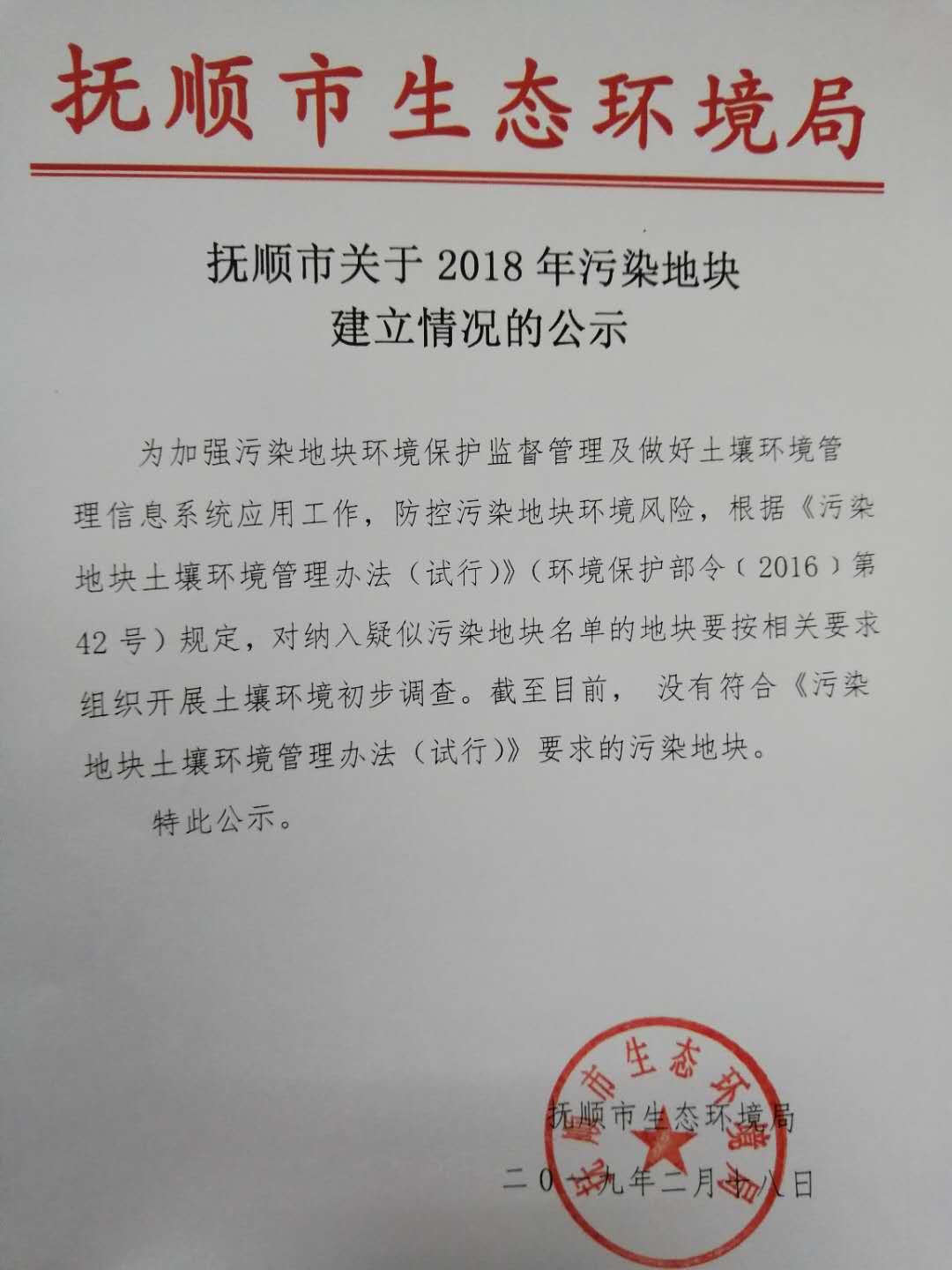 抚顺市关于2018年污染地块建立情况的公示