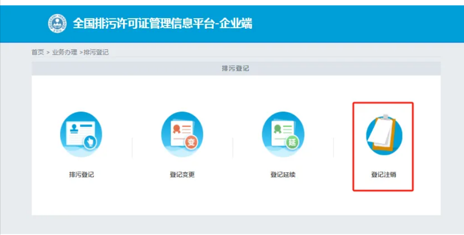 4.进入排污登记页面,点击“登记注销”注销已失效的排污登记。